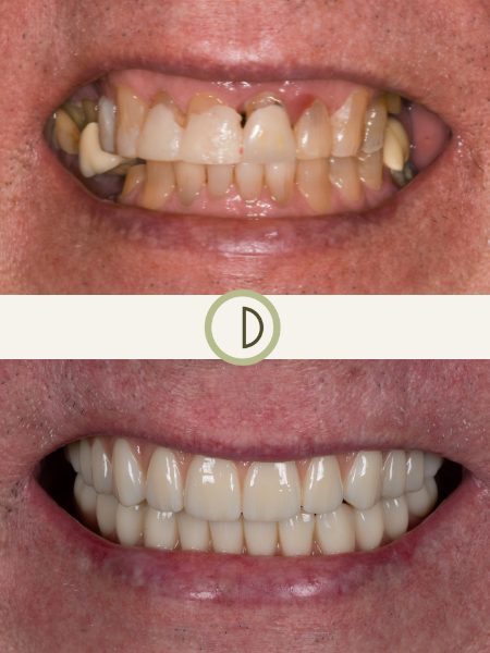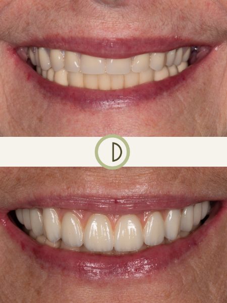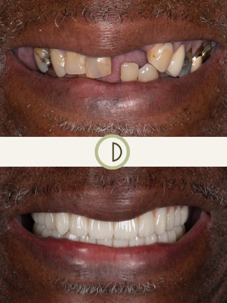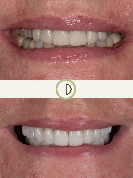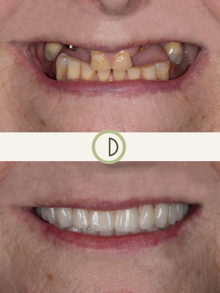 After years of addressing isolated dental problems and subsequent tooth loss, this patient found us. Dr. Conover and his team were able to provide a comprehensive approach to her complicated dental needs. In conjunction with one of our gifted Periodontist colleagues, we delivered full arch dental prosthetics retained by dental implants to both restore her smile and provide a predictable, functional, and durable result. After guarding her smile for years, she can no chew and smile without fear of discomfort or embarrassment. The upper denture prosthetic is permanently affixed to 6 dental implants, and is only removed for hygiene maintenance at the office.