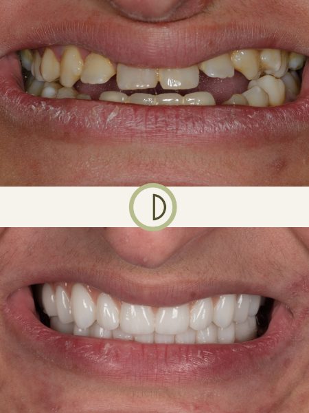 This patient came to us looking to refresh her ceramic crowns that were placed over 20 years ago to mask tetracycline staining. Additionally, the crown on tooth #6 had recently been replaced, but the patient was dissatisfied with its contour and shade, which didn’t meet their expectations for a natural, harmonious smile. Dr. Conover replaced the entire upper arch with a new set of crowns, custom-designed to match the patient’s desired results. Using the latest in dental technology and materials, we created a more natural and vibrant smile, ensuring both the contour and shade were perfectly suited to their facial features. The patient was thrilled with the outcome, and the transformation provided them with renewed confidence in their smile.
