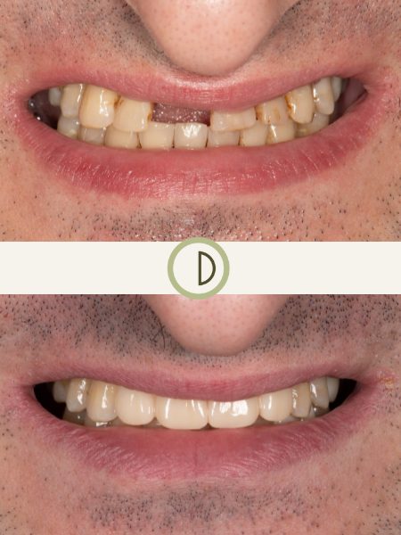 This patient came to Dr. Vafa with a front tooth missing. All the other front teeth were so loose that they were painful. Dr. Vafa replaced the painful and missing teeth with dental implants, giving this patient his smile back.