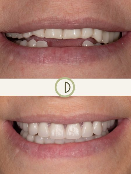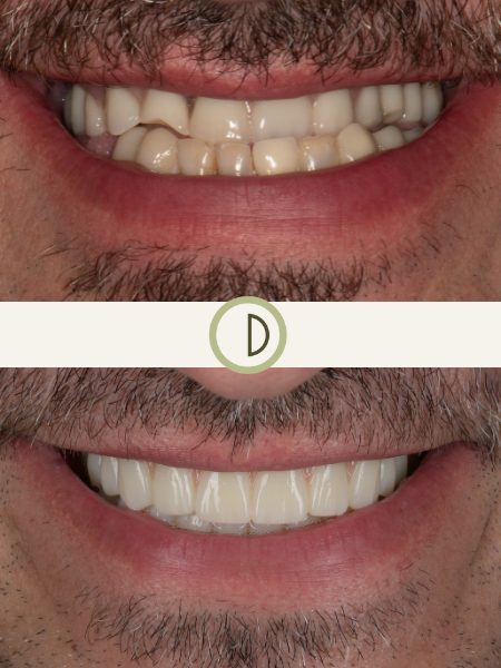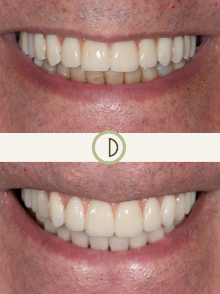 After a front tooth broke, our patient decided to enhance his smile with a more limited approach to improve the appearance of his upper four front teeth. A combination of 2 porcelain veneers, 1 ceramic crown and 1 dental implant crown provided him with the smile enhancement he was looking for. Case completed by Dr. Conover.