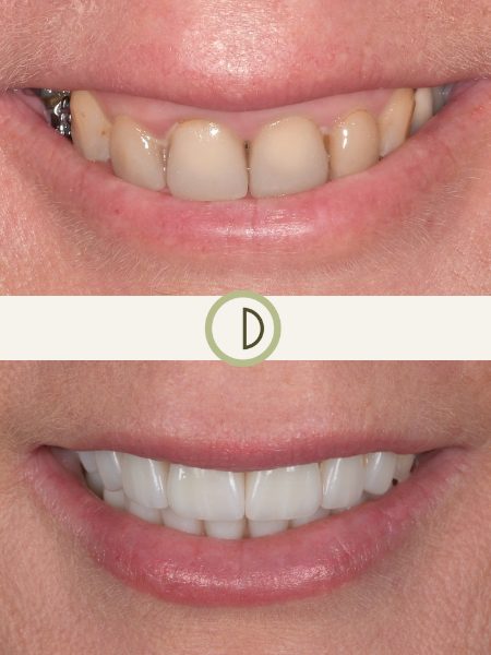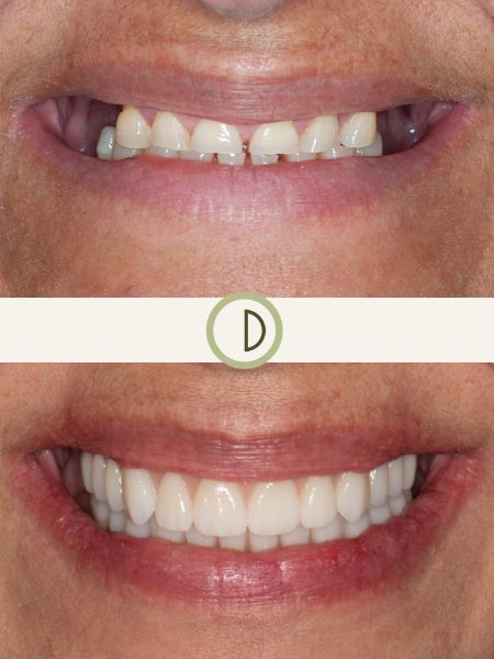Our patient presented to improve the appearance of her front teeth. A condition called external resorption caused by a childhood accident led to the loss of her front right tooth. As seen in the before photos, the gum lines have receded around her existing veneer and there is a lack of symmetry and color harmony between the 2 front teeth. When the dental implant on her front right tooth was ready for a new crown, we provided the patient the esthetic enhancement she desired with 4 ceramic crowns. The result shows a near seamless blending color and shape between the new ceramic restorations and her existing natural teeth. Now a new mom, she couldn’t be happier with the outcome. Case completed by Dr. Conover.